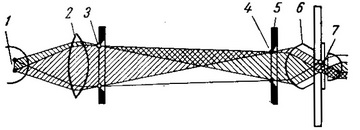 Рис. 1. Схематичне зображення ходу променів при освітленні препарату за методом Келера: 1 - нитка лампи; 2 - колектор; 3 - діафрагма поля; 4 - зображення нитки лампи в площині апертурної діафрагми; 5 - апертурна діафрагма; в - конденсор; 7 - зображення країв діафрагми поля в площині препарату.