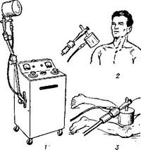 ![]() Рис. 4. Апарат для мікрохвильової терапії «Промінь-2». Рис. 5. Мікрохвильова терапія при гаймориті. |