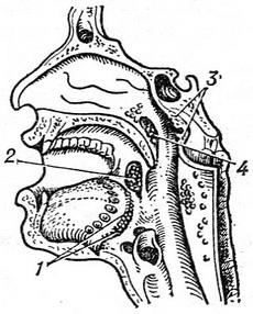 ![]() Глотковий лімфаденоїдного кільця Пірогова - Вальдейера: 1 - мовний мигдалина; 2 - піднебінна мигдалина; 3 - носоглоткова (глоткова) мигдалина; 4 - скупчення лимфаденоидной тканини у глоткових гирла слухової труби. |