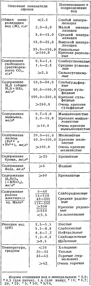 Критерії оцінки мінеральних вод. М. в. справляють на організм людини лікувальну дію всім комплексом розчинених у них речовин, а наявність у них специфічних біологічно активних компонентів (CO2, H2S, As і ін.) і особливих властивостей визначає часто методи їхнього лікувального використання. В якості основних критеріїв оцінки лікувальних М. в. радянської курортології прийняті особливості їхнього хімічного складу і фізичних властивостей, що одночасно служать найважливішими показниками для їхньої класифікації.