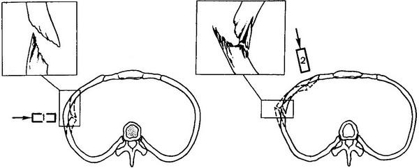 Рис. 81. Характер додаткових руйнувань в зоні первинних переломів ребер при повторних впливах. 1 - первинне; 2-повторне вплив.