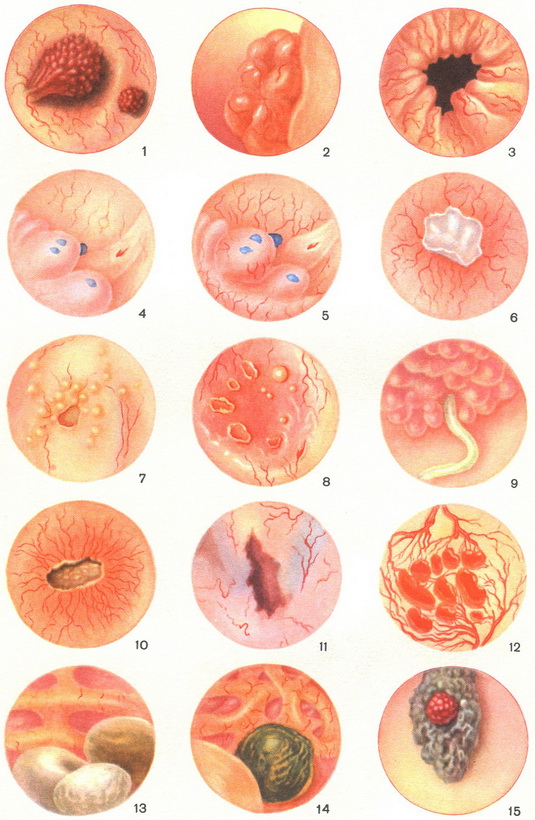 Рис. 1. Папіломи сечового міхура. Рис. 2. Папілярний рак сечового міхура. Рис. 3. Дивертикул сечового міхура. Рис. 4 і 5. Ендометріоз сечового міхура (рис. 4 - в межменструальном періоді; рис. 5 - під час менструації). Рис. 6. Лейкоплакія сечового міхура. Рис. 7. Туберкульозні горбки навколо гирла сечоводу. Рис. 8. Туберкульозні виразки сечового міхура. Рис. 9. Бульозний набряк навколо гирла сечоводу при туберкульозному пионефрозе (з гирла виділяється густий гній). Рис. 10. Проста виразка сечового міхура. Рис. 11. Трофічна виразка сечового міхура. Рис. 12 і 15. Більгарціоз сечового міхура. Рис. 13. Камені (фосфати) сечового міхура. Рис. 14. Камінь (оксалат) при аденомі передміхурової залози.