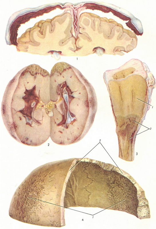 Рис. 1. Масивне субдуральное крововилив, розвинуте як наслідок медуллизации кісток черепа. Рис. 2. Дифузне экстрамедуллярное кровотворення в нирці, крововиливи в порожнину миски і під капсулу (хлопчик 4 років). Рис. 3. Нижня третина стегна на розпилі, що складається з компактної кісткової тканини (костномозговой канал відсутній): 1 - компактна кісткова тканина; 2 - пояс більш порозной кісткової тканини. Рис. 4. Кістки склепіння черепа при мармурової хвороби: 1 - медуллизация компактного шару, що надає поверхні кістки своєрідний шорсткий губчастий вигляд; 2 - на розпилі губчасту речовину кістки заміщено компактним.