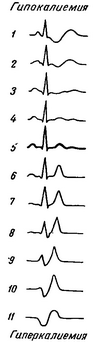 ![]() Зміни ЕКГ при порушеннях вмісту калію в крові; зверху вниз - перехід типів ЕКГ від гіпо - до гіперкаліємії; ЕКГ 5 відповідає нормі (за Гесслеру). |