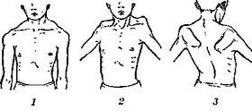 ![]() Плечі-лопатково-лицьова форма міопатії: 1 - хворий в стані спокою; 2 і 3 - при спробі відвести руки до горизонталі.  |