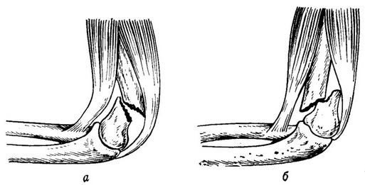 Рис. 36. Згинальні (флексионные (а) і розгинальні (экстензионные) (б) надмыщелковые переломи плечової кістки.
