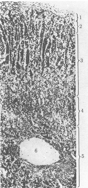356. Зріз наднирників людини. 1 - капсула; 2 - клубочкова зона; 3 - пучкова зона кіркової речовини; 4 - сітчаста зона кіркової речовини; 5 - мозкова речовина; 6 - ворота наднирника.  |