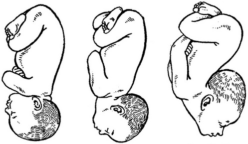 Причини. Головка плоду нерідко вступає у вхід тазу не в зігнутому, а в розігнутому стані. Залежно від ступеня розгинання голівки (помірне, середнє і максимальне) виникає той чи інший вид передлежання, а саме переднеголовное, лобне або лицьове передлежання (рис. 77, 78, 79).