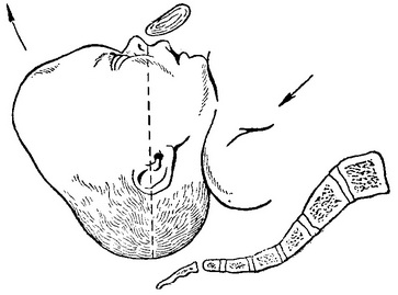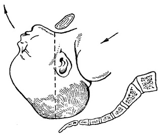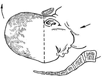Рис. 79. Повне розгинання голівки (III ступінь) - лицьове передлежання.