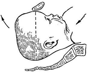 Рис. 78. Прогресуюче розгинання голівки (II ступінь) - лобне передлежання.