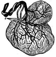 ![]() Рис. 69. Плацента з додатковою часткою. Судини частково проходять в оболонках (а). |