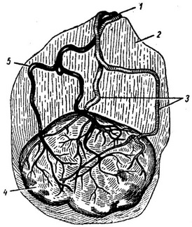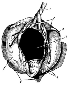 ![]() Рис. 70. Оболочечное прикріплення пуповини. 1 - пуповина; 2 - оболонки; 3 - пупкові артерії; 4 - плацента; 5 - пупкова вена. |