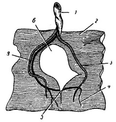 ![]() Рис. 72. Оболочечное прикріплення пуповини. Місце прикріплення пуповини в оболонках знаходиться проти плаценти. 1 - пуповина; 2 - пупкові судини; 3 - оболонки; 4 - плодова поверхня посліду; 5 - краю розірваних оболонок; 6 - плацента; 7 - оболонки. |