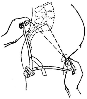 В. С. Легенченко рекомендує під час потуг, при положенні вагітної лежачи на спині з трохи піднятим узголів'ям ліжка, спиратися ногами в стояки ногодержателей, відштовхуючи їх від себе, і одночасно обома руками щосили тягнути стояки (або «віжки») ногодержателей на себе.