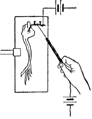 Приготування ізольованою задньої лапки жаби. Жабу обезголовлювали (рис. 1), залишаючи нижню щелепу, розрізають майже навпіл, знімають шкіру е задніх лапок (панчіх) і розрізають їх по одній для роздачі на столи. Для демонстрації властивості нерва, крім усього цього, обережно відокремлюють від оточуючих тканин нерв, що йде до м'язів лапки. Лапку прикріплюють до вертикально встановленої дощечці. Кінець нерва поміщають на гачки (рис. 2).