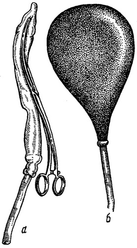 Операція метрейриза може застосовуватися при частковому передлежанні плаценти і невеликій кровотечі слідом за розкриттям плодового міхура. Метрейринтер являє собою гумовий балон грушоподібної форми ємністю 200-250 мл Перед застосуванням його стерилізують кип'ятінням, згортають зразок сигари (рис. 16) і в такому вигляді вводять через шийковий канал або через зовнішній матковий зів в порожнину плодового мішка, тобто интраамниально. Введення метрейринтера проводиться під контролем пальця або з попереднім введенням піхвових дзеркал. Після того, як метрейринтер введений, необхідно розтиснути бранші інструменту, яким захоплювався метрейринтер, але не витягати інструмент, щоб не видалити метрейринтер. Потім балон повільно заповнюється стерильним розчином або з допомогою великого шприца, або з кухля Есмарха, в яку заздалегідь наливають потрібну кількість розчину. Після заповнення метрейринтера до кінця його підвішується вантаж 200 - 300 м (рис. 17). Тривалість перебування метрейринтера в порожнині матки не повинна бути більше 6-8 год. Правильно введений метрейринтер, придавлюючи кровоточиві судини, що призводить до зупинки кровотечі і, крім того, посилюючи родову діяльність, сприяє більш швидкому розкриттю шийки матки. Коли через кілька годин метрейринтер народжується, розкриття зіву буває близько до повного. Передлежачої частина плоду слідом за народженням метрейринтера опускається і притискає кровоточиві судини.