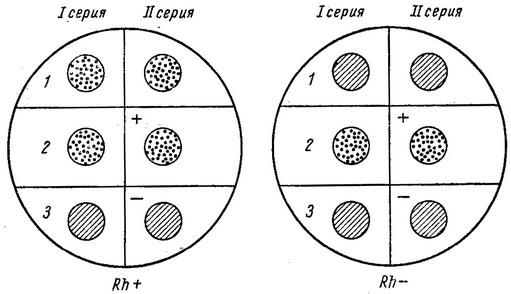 Резус-фактор визначається двома серіями антирезусних сироваток, підібраних відповідно до групової приналежності досліджуваної крові. Кров береться з вени у чисту суху пробірку в кількості 1-3 мл Чашка Петрі маркується олівцем-склографом так, як показано на рис. 47, після чого очною піпеткою на ліву половину чашки наносяться по дві краплі антирезусной сироватки однієї серії, а на праву половину - по дві краплі сироватки другої серії. Потім в обидві сироватки верхнього ряду додається по одній краплі 10% суспензії досліджуваних еритроцитів, набраних з дна пробірки пастерівської піпеткою. До сироватки середнього ряду додається по одній краплі 5-10% сироваткової суспензії стандартних резус-позитивних еритроцитів, а до сироватці нижнього ряду - по одній краплі стандартної суспензії резус-негативних еритроцитів. Шляхом додавання стандартних резус-позитивних і резус-негативних еритроцитів перевіряється активність і специфічність сироваток. Якщо сироватки обох серій активні, то з резус-позитивними еритроцитами вони дадуть аглютинацію. Відсутність аглютинації з резус-негативними еритроцитами підтверджує специфічність стандартних сироваток. Після перемішування крапель шляхом легкого похитування чашки Петрі її поміщають у водяну баню при температурі від 46° на 10 хв. Через 10 хв чашку виймають з бані, обережним погойдуванням чашки перемішують еритроцити з сироваткою і при хорошому освітленні на білому тлі читають результат реакції.