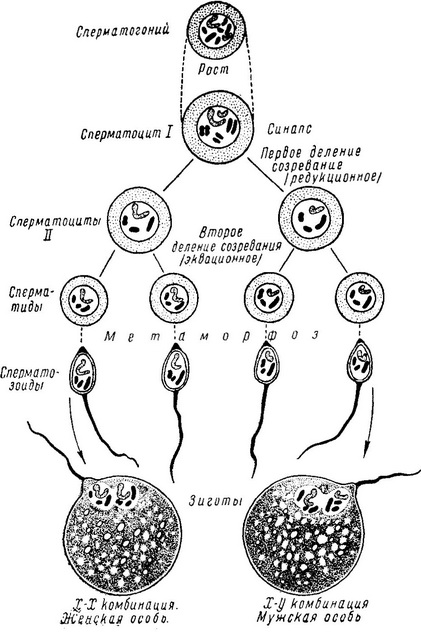 У момент дозрівання статевих клітин процес редукції хроматину призводить до того, що жіноча яйцевая клітка (одна з чотирьох, здатна до запліднення) містить одну хромосому, а кожен сперматозоїд (всі чотири, придатні для запліднення) - по Х-хромосомі (два) і по Y-хромосомі (два).