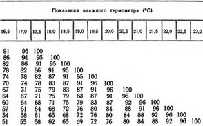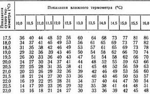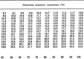 Максимальну вологість (F) визначають за допомогою табл. 2 по температурі сухого термометра.
