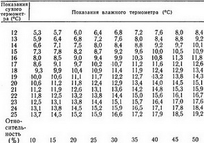 Для визначення відносної вологості існують спеціальні таблиці (табл. 3, 4). Більш точні свідчення дає психрометр Ассмана (рис. 3). Він складається з двох термометрів, укладених в металеві трубки, через які рівномірно просасывается повітря з допомогою заводної вентилятора, що знаходиться у верхній частині приладу. Ртутний резервуар одного з термометрів обгорнутий шматочком батіста, який перед кожним визначенням змочується дистильованою водою за допомогою спеціальної піпетки. Після того як омочили термометр, заводять ключем вентилятор і вішають прилад на штатив. Через 4-5 хв записують показання сухого і вологого термометрів. Так як з поверхні ртутного кульки, змоченого термометра, відбувається випаровування вологи і поглинання тепла, то він буде показувати більш низьку температуру. Обчислення абсолютної вологості проводять за формулою Шпрунга: