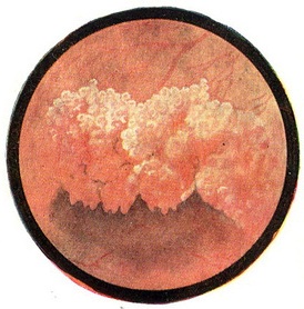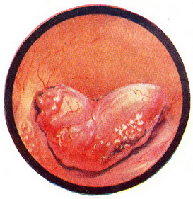 ![]() Рис. 109. Грубоворсинчатая інфільтруючим пухлина сечового міхура на широкій основі. |
