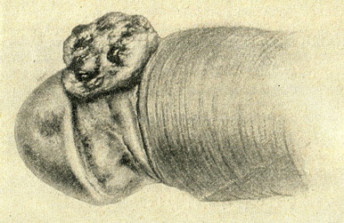 Найчастіше рак статевого члена відзначається у людей у віці від 40 до 60 років. Улюблена локалізація - головка статевого члена, внутрішній листок крайньої плоті або - найчастіше - вінцева борозна (рис. 123).