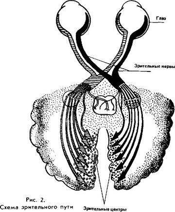 Рогова оболонка та інші прозорі середовища ока носять назву оптичних середовищ, а властивість очі заломлювати промені світла називається рефракцією. Сила оптичних середовищ вимірюється в діоптріях. Одна діоптрія відповідає заломлюючої силі скла з фокусною відстанню в один метр. Заломлююча сила ока у новонароджених досягає 80 діоптрій, у старших дітей і дорослих приблизно 60 діоптрій. Самою внутрішньою оболонкою очного яблука є сітківка. Вона прозора, вистилає зсередини близько 2/3 поверхні судинної оболонки. Товщина сітківки близько 0,1 міліметра, тим не менш її будова дуже складне. В ній розрізняють до 10 шарів, в тому числі шар світлосприймаючих клітин - паличок і колбочок; число їх досягає відповідно 130 і 10 мільйонів штук. Основна маса колбочок сітківки зосереджена в центрі - жовтій плямі. При цьому чим далі від центру, тим колбочок стає менше, а число паличок, навпаки, зростає. По периферії сітківки, як правило, відзначаються лише палички. Вони краще функціонують при слабкому освітленні, колбочки ж, навпаки - при денному або штучному освітленні. Палички і колбочки закінчуються нервовими волокнами, які, збираючись разом, утворюють зоровий нерв. Внутрішньоочна частина зорового нерва має вигляд диска блідо-рожевого кольору, в той час як дно очі червоне. Тут бере початок зоровий шлях, що включає в себе крім зорових нервів їх частковий перехрест. Після цього перехреста нерви набувають нову назву - зорові тракти. Кожен з них містить зорові волокна від обох очей і закінчується в зорових центрах, розташованих у потиличних частках великих півкуль головного мозку (рис. 2). Саме тут відбувається усвідомлення видимих предметів зовнішнього світу - відчуття їх форми, величини, кольору, ступеня віддаленості від ока і т. д.
