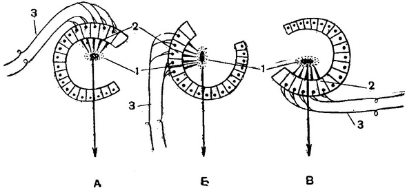 А. Положення голови вниз тім'ям. Б Нахилене положення готові. В. Положення голови вгору тім'ям (нормальне). 1 - Отоліти; 2 - волоскові чутливі клітини; 3 - доцентрові нерви