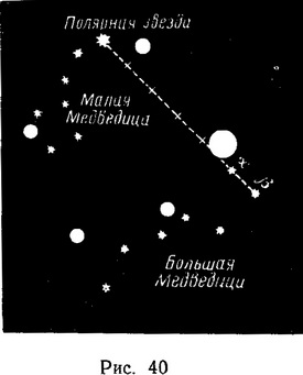При відсутності компаса точніше, ніж за місцевими ознаками, напрямок сторін обрію можна визначити по небесним світилам - Полярній зірці, сонцю. Полярна зірка завжди знаходиться на півночі. Якщо стати обличчям до Полярної зірки, то попереду буде північ, ззаду - південь, праворуч - схід, ліворуч - захід (рис. 40).