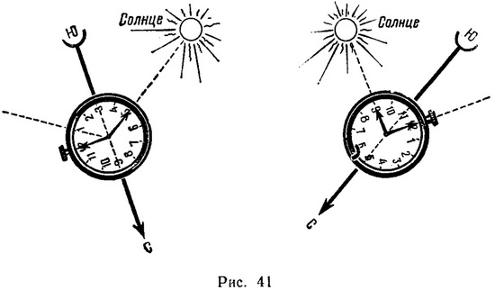 Близько 7 год ранку сонце на сході; опівдні, близько 13 год, на півдні, тіні тоді самі короткі і спрямовані на північ; близько 19 год тіні на заході. У зазначені години по положенню сонця і наближено визначаються напрямки на сторони горизонту. У будь-який час дня, маючи годинник, по сонцю неважко визначити сторони горизонту. Для цього треба годинникову стрілку горизонтально розташованих годин направити до сонця або до орієнтиру, який перебуває під сонцем (мал. 41). Кут між годинниковою стрілкою і цифрою 1 розділити навпіл. Лінія, делящая кут навпіл, буде вказувати напрям на південь. До полудня треба ділити кут, який годинна стрілка повинна пройти до 13 год, а після полудня той, який вона пройшла після 13 ч. Цей спосіб дає відносно правильні результати в північних широтах взимку, менш точні - навесні і восени. Влітку помилки можуть досягати 20-25°. У південних широтах цим способом користуватися не рекомендується.