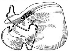 ![]() Рис. 2. Опорна шапочка для вертикальної зовнішьоротової гумової тяги при лікуванні відкритого прикусу і горизонтальної тяги для переміщення верхніх зубів на базисі щелепи назад. |