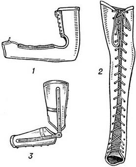 Фіксуючі ортопедичні апарати нерідко бувають шинно-гільзовою конструкції. Виготовляють їх у вигляді тутора (суцільний гільзи без шарнірів), на зчленовуються сегменти кінцівок (рис. 1) або на всю кінцівку (рис. 2), жорсткого корсета або з гільз, сполучених шарніром (рис. 3). Мета цих ортопедичних апаратів - повністю знерухомити кінцівку (частина тіла) або частково обмежити рухи в суглобі. Розвантажують ортопедичні апарати - корсети - сприяють перенесенню опори з ураженого відділу на сусідні, частіше на кісткові виступи (рис. 4). Коригуючі ортопедичні апарати забезпечують виправлення деформацій. У більшості випадків виготовляють ортопедичні апарати змішаних конструкцій, призначені для фіксації, і для розвантаження (рис. 5, 7, 8, 9). При укороченні нижньої кінцівки понад 12 см застосовують функціонально-анатомічний косметичний ортопедичний апарат (рис. 6). Останнім часом створюють функціональні ортопедичні апарати для відновлення функцій м'язів за рахунок використання зовнішніх джерел енергії шляхом перетворення біострумів, усиливаемых спеціальною апаратурою.