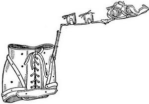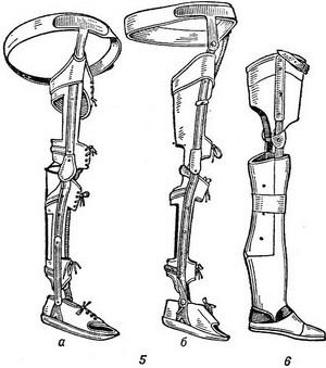 ![]() Рис. 5. Замковий (а) і беззамковый (б) апарати з поясом на нижню кінцівку. Рис. 6. Апарат з дерев'яною гільзою гомілки (протез) при укороченні нижньої кінцівки. |