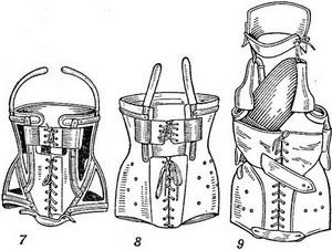 Розрізняють корсети жорсткі, напівжорсткі, м'яко-еластичні. У жорстких корсетах обидві симетричні половини жорстко скріплені між собою. Жорсткі корсети (гіпсові, нитролаковые) призначають при туберкульозі хребта з великими руйнуваннями хребців або при інших захворюваннях, що викликають подібні деформації; напівтверді, які не мають жорсткого з'єднання симетричних половин корсета, - шинно-шкіряні (рис. 3), шинно-матерчаті Гессинга - при захворюваннях, що протікають з невеликим руйнуванням хребців; м'яко-еластичні - матерчаті з планшетками з гнучкої сталі або пластмаси - при деформуючих сколіозах.