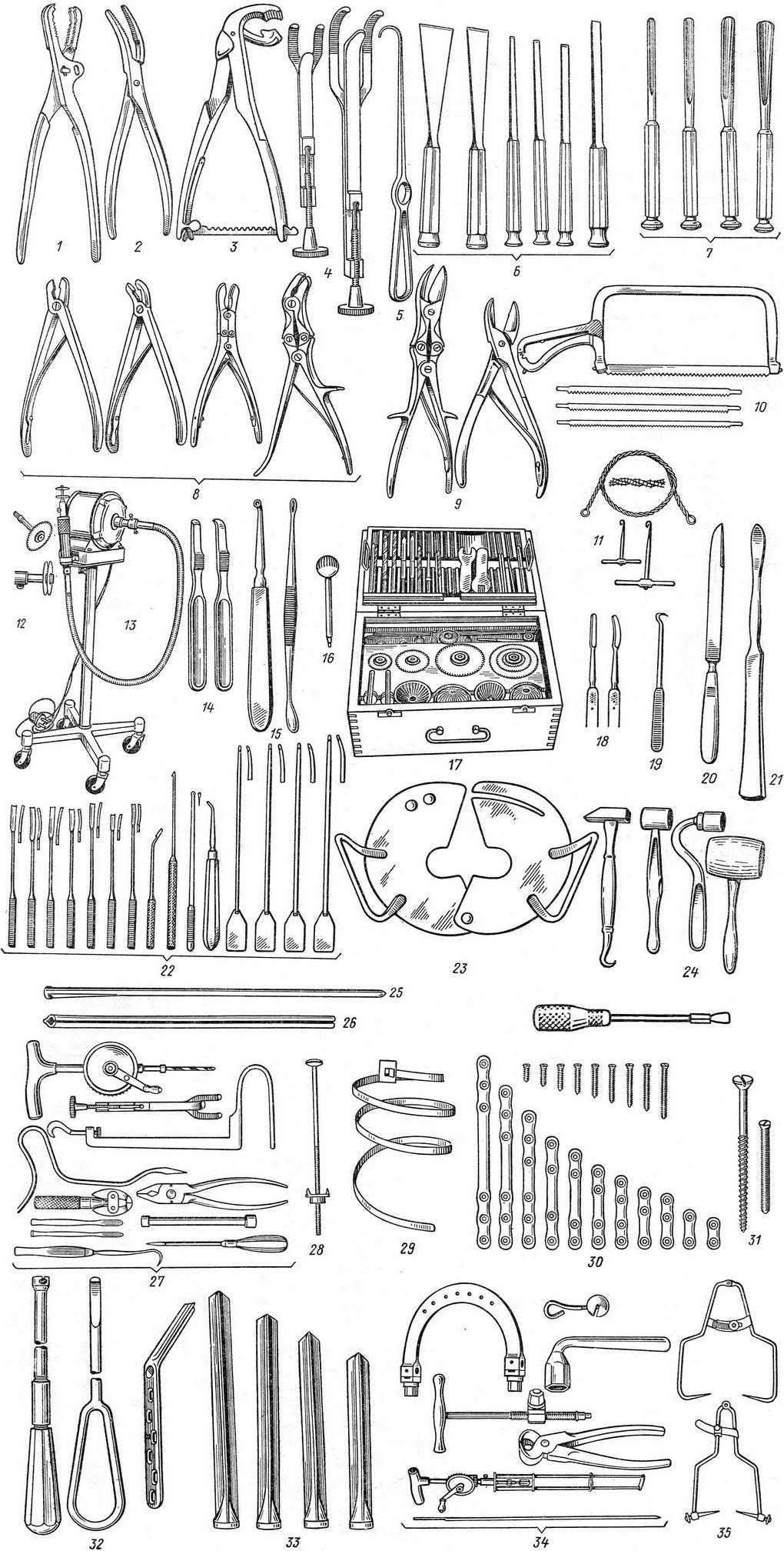 До загальних інструментів відносять долота, кусачки, распаторы, гачки, підйомники, пили, фрези, апарати для механічної обробки кісток. У долотах Бергманна леза безпосередньо переходять в ручку (рис. 1). Долота Макъюина мають восьмигранну ручку і розширену майданчик для удару (рис. 2). Набір ЦИТО складається з доліт різних розмірів (рис. 55): 6 доліт з двостороннім заточуванням, 6 доліт-стамесок з одностороннім заточуванням, 9 желобоватых і 2 трапецієподібної форми. Відомі різні типи кусачок: з прямими губками (рис. 3), з круглими (рис. 4) і з прямокутними (рис. 5). Для відшарування м'яких тканин від кістки застосовують распаторы: прямі (рис. 6), вигнуті (рис. 7) та овальні (рис. 8). Для утримання кісток під час операцій використовують костедержатели: двухрожковый (рис. 9), трьохріжковий (рис. 10) і типу Ламботта (рис. 11). Часто буває зручно утримувати відламки кісток однозубым гачком (мал. 12). Пилки для кісток застосовують наступних типів: рамкова (рис. 14) і ножова (рис. 13), а для фігурного розсічення кісток - дротяна пилка Джильї (рис. 15) і непрерывноцепная електропила Сиваша (рис. 16). Для свердління кісток служать фрези з коловоротом (рис. 17) і грибоподібні (рис. 18), що приводяться в рух електродвигуном.