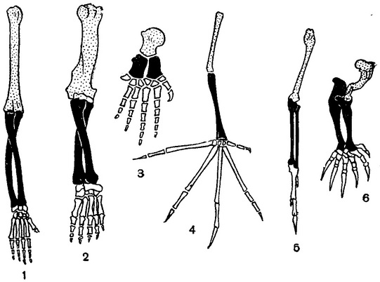 Рис. 9. Скелети передніх кінцівок різних хребетних тварин і людини (саморобна таблиця):