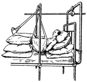 ![]() Рис. 26. Положення хворого в ліжку після переднього спондилодезу. |