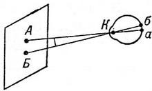 Практичної мірою гостроти зору вважається величина, зворотна куті зору (рис. 1), тобто куті, утвореному променями, що йдуть від країв розглянутого предмета або від двох даних точок (Л і В) до вузлової точки ока (А'); у даному випадку - кут АКБ. Чим менше кут зору, допускає роздільне бачення двох точок, тим більше О. з. У більшості людей мінімальна величина цього кута дорівнює одній хвилині (М), тому цю величину і прийнято вважати нормою, а О. з. очі, що має найменший кут зору в 1',- нормальної О. з.