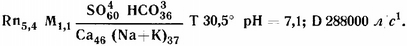 * Для характеристики фізико-хімічного складу лікувальних мінеральних вод курортів ми і надалі будемо користуватися загальноприйнятою формулою, запропонованої проф. М. Р. Курловим і проф. Е. Е. Карстенсом. На початку формули вказується вміст газу і активних елементів в грамах на 1 л. Радон (Rn) дається в одиницях Махе. Позначається буквою М ступінь мінералізації - сума аніонів, катіонів і недиссоциированных молекул, виражених в грамах. Ставлення переважаючих аніонів і катіонів зображується у вигляді дробу, в чисельнику якої зазначаються переважаючі аніони, в знаменнику - катіони (при утриманні не менше 20-25% суми еквівалентів для аніонів і окремо для катіонів). Наприкінці формули вказується температура (Т) води мінерального джерела при виході) в градусах, рН і дебіт (D) в літрах на добу.