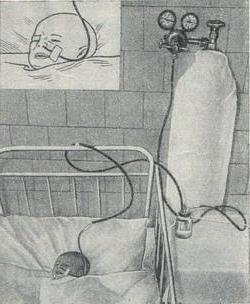 Киснева палатка. Тент з не пропускає газ матеріалу (рис. 3) підвішують на спеціальному утримувачі над узголів'ям ліжка, а вільні краї його заправляють під матрац, таким чином голова хворого розташовується під тентом.
