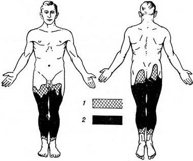 При надходженні в стаціонар у обпаленої визначають артеріальний тиск, беруть кров для аналізів, виробляють точний розрахунок розмірів обпаленої поверхні, дані заносять в листок-карту і замальовують на схемі (рис. 2). Якщо обпечені обидві руки, то кров'яний тиск визначають механокардиографом, а кров беруть з мочки вуха або з вени на нозі. Негайно починають облік кількості введеної хворому рідини і виділеної сечі (кожні 1-3 години і в цілому за добу). При мимовільному сечовипусканні сечу треба збирати катетером.