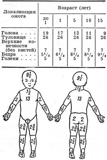 Опіки у дітей найчастіше виникають у результаті впливу гарячих рідин, полум'я, розжарених предметів. Клінічні прояви залежать від площі опіку, його ступеня, віку дитини і складаються із загальних і місцевих симптомів. У дітей розрізняють ті ж ступеня опіку, що і у дорослих, але при однакових температурних впливах шкіра дітей пошкоджується сильніше. При першому огляді нерідко важко визначити точно ступінь опіку; у дітей частіше зустрічається поєднання опіків різних ступенів. При опіках з великою площею ураження розвивається шок, причому у дітей він може виникнути вже при опіку 5-8% поверхні тіла, а в грудному віці навіть 3%. Тому дуже важливо визначити площу опіку за схемою (рис. 3) і таблиці.