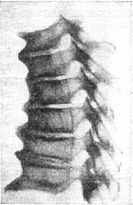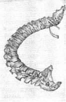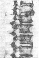 ![]() Рис. 1. Важкий деформуючий спондильоз з окостенением передньої поздовжньої зв'язки на протязі від IV до IX грудного хребця. (З поховання 1 ст. до н. е..) |