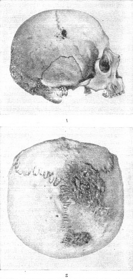 Рис. 4. Остеолитический метастаз в черепі літньої жінки (1); раковий остеофитоз в кістках того ж черепа (2). (З поховання 10-12 ст.) |
