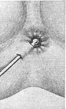 ![]() Зонд, введений в підшкірно-підслизовий свищ. |