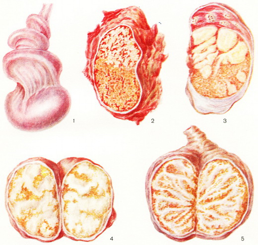 Рис. 1. Перекрут яєчка. Рис. 2. Інфаркт яєчка. Рис. 3. Туберкульоз яєчка з наявністю казеозного некрозу. Рис. 4. Сифіліс яєчка з масивними вогнищами некрозу. Рис. 5. Фіброз яєчка.
