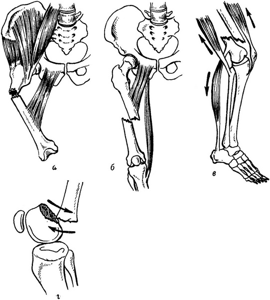 Рис. 62. Зміщення відламків стегна. а - зміщення під кутом, відкритим досередини, при переломі стегна у верхній третині; б - зміщення по ширині і по довжині при переломі стегна в середній третині; - зміщення дистального відламка назад при переломі стегна в нижній третині; р - епіфізеоліз дистального епіфіза стегна зі зміщенням відламків.