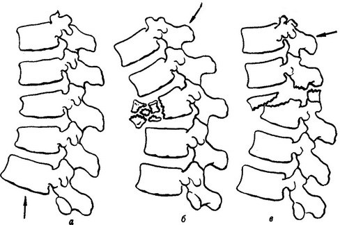 Перші три типи переломів виникають при одному механізмі травми - згинанні хребта під впливом травмуючої сили, яка призводить до здавлення тіла хребця, в результаті чого він приймає клиноподібну форму (рис. 53). У разі, якщо згинання хребта відбувається різко, передній відділ одного з хребців, що піддаються найбільшому тиску, розколюється на дрібні уламки. У разі, якщо поряд з ушкодженням тіла хребця порушена цілість дужок і суглобових відростків верхній відділ хребта зміщується допереду, утворюється переломо-вивих. Переломи поперечних і остистих відростків наступають найчастіше в результаті надмірного скорочення що прикріплюються до них м'язів.