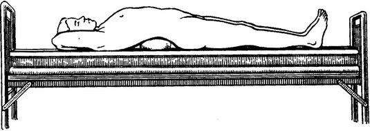 Рис. 54. Положення хворого в ліжку при переломі тел нижньогрудних і поперекових хребців.