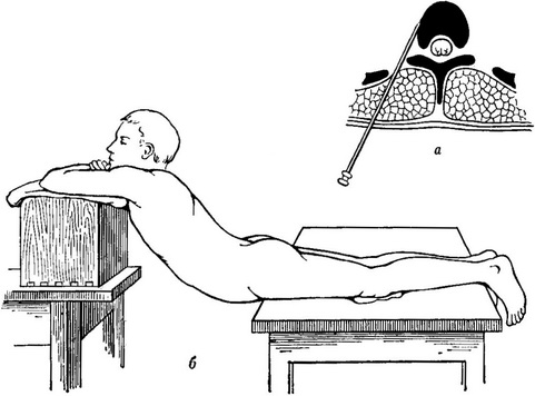 Рис. 55. Одномоментне розправлення компресійного перелому тіла нижніх грудних і поперекових хребців. а - схема введення голки для місцевого знеболювання перелому тіла хребця по Шнеку; б - положення хворого.
